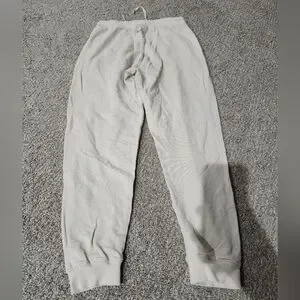 Soft cream joggers with ribbed cuffs and a drawstring waist. Casual, comfortable silhouette. Versatile neutral color for easy styling.