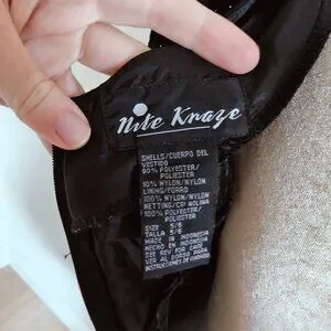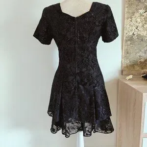 Has some shoulder padding, two tiered bottom, and black velvet with sparkles and lace floral cutouts. Gorgeous!