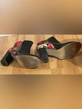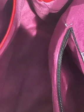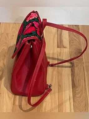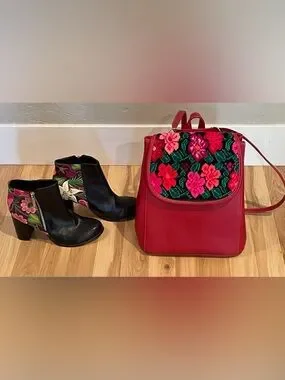Bright red vinyl backpack with decorative embroidered trim on flap. Black man made material ankle boots with floral design embroidered in fabric on back side of each boot. Boots are size 9 and have been well loved as indicated in pictures. Bag in great condition barely used her.