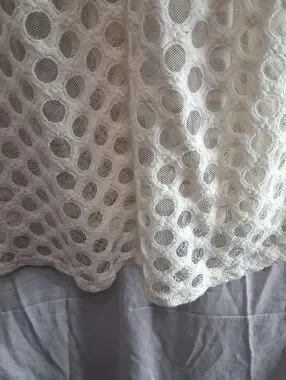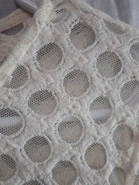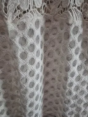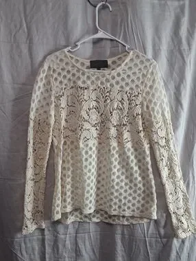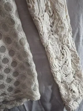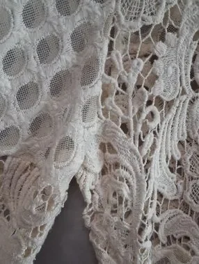 Delicate cream blouse with all-over crochet mesh. Floral lace panels across the chest and along the sleeves. Lightweight and breathable fabric. Feminine, versatile top for layering.