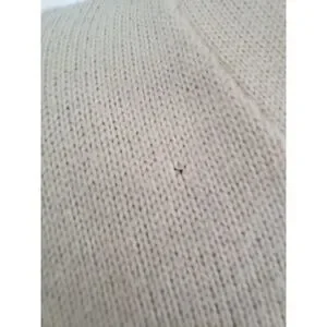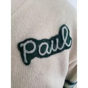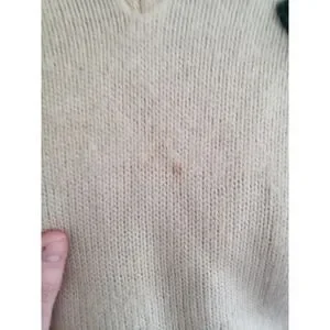 This beige and Green sweater has some mild flaws but is in good condition for its age.
