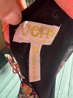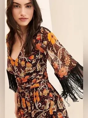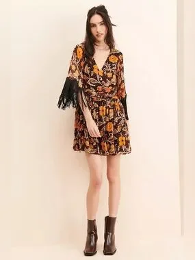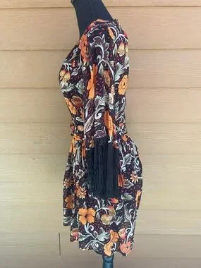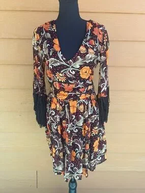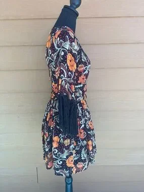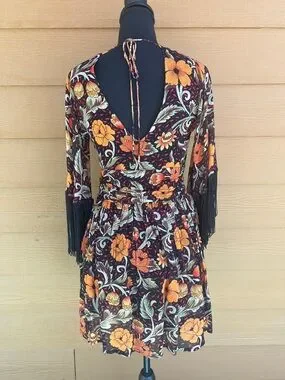 Floral patterned fringe mini dress with deep V front and back with tie neck. Hidden side zipper, fringed arms, fully lined. Cinched waist. Made in India.