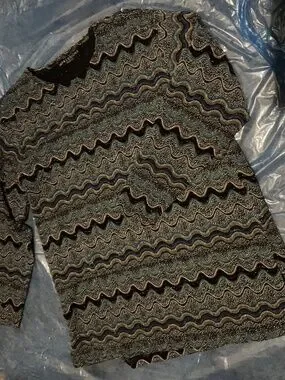 WOMENS BEADED ALL OVER SEQUENCED LONG SLEEVED T-SHIRT .. BLUE COLORS SAME AS OTHER LISTED TSHIRT THAT IS BROWN COLORS ,, ‘’ MADE BY ‘’IMPRESSIONS LIFESTYLE ‘’’ SIZING SHOWN IN PICTURES COMPARABLE TO SIZE LARGE ,, HAS STRETCH , ONLY WORN ONCE THEN PACKED AWAY .. COOL LONG SLEEVED TSHIRT . DONT MISS OUT