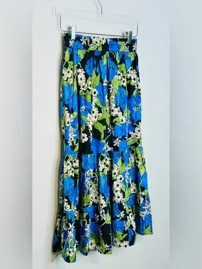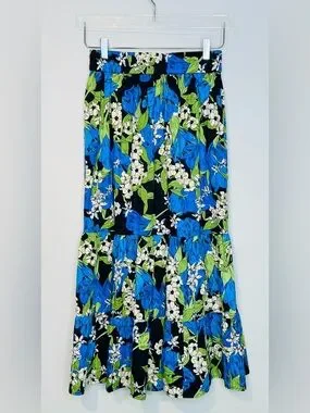 Boho-chic essential for your summer wardrobe this midi skirt, featured in the night bloom print, is sure to become a favorite. Elasticized, banded waistband. An a-line, tiered midi skirt. Pull on style. Unlined.