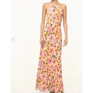 Lightweight floral halter dress with a backless design. Thin straps and a subtle V-front. Soft pink and yellow floral print on a cream background. Feminine silhouette ideal for warm-weather events.