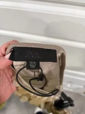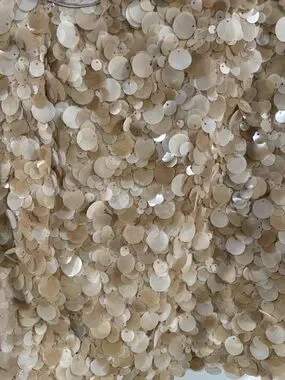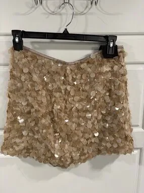 Soft satin mini skirt with cascading round sequins. Champagne-beige shimmer adds subtle shine. Feminine and playful silhouette. Great for evening looks.