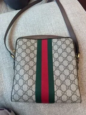 Iconic Gucci GG Supreme canvas crossbody. Brown leather trim and gold double G hardware. Signature green and red web stripe down center. Adjustable shoulder strap. Classic luxury style.