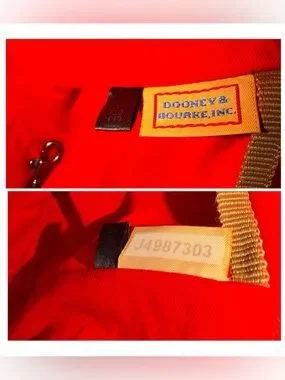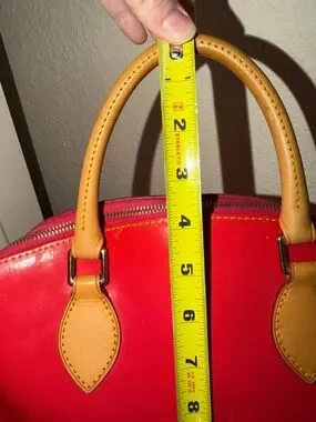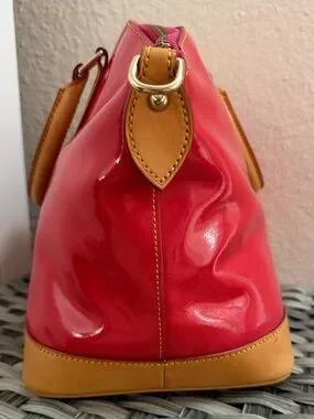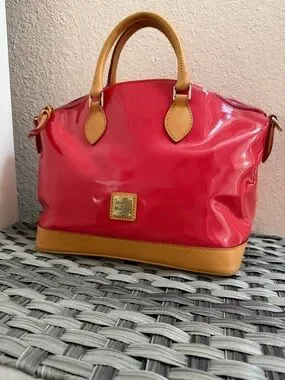 Dooney & Bourke patent leather satchel in a vibrant red-orange shade with classic tan leather trim. Originally purchased as “hot pink,” but the true color reads more red/orange in person with subtle pink tones at the zipper stitching.