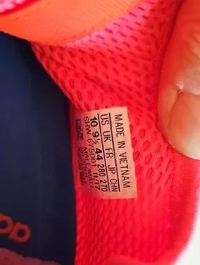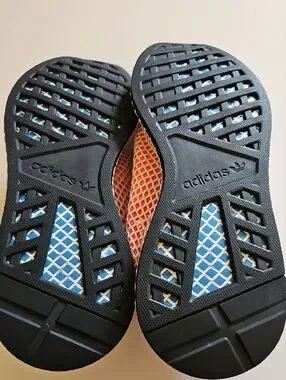 Lightweight Adidas mesh sneakers in coral and white. Breathable upper with cushioned support. Lace-up design for a secure fit. Good used condition with minimal wear. slight discoloration from use. The bottoms of the shows show no signs of wear and minimal inside wear. Size 10 Men's. A Great pair of lightly used running shoes.