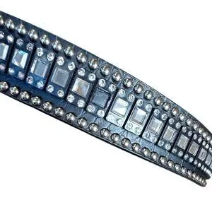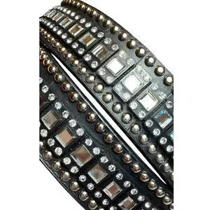 • Intricate Detailing: Features a combination of large clear crystals, square mirrored studs, and silver-tone round rivets along the entire length.