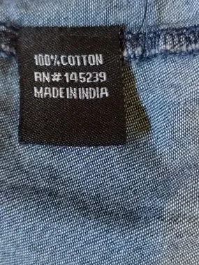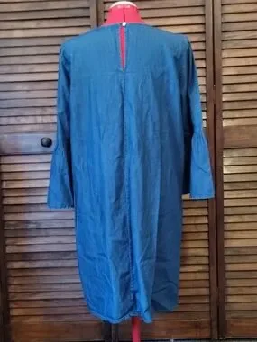 Short chambray dress, blue with pearlized buttons on the front, back 1 button closure, and ¾ length bell sleeves. 100% cotton. Size 2X. Approximate flat measurements: Bust - 22½ inches, Sleeve Length - 19½ inches, Length from Shoulder to Hem - 36 inches.