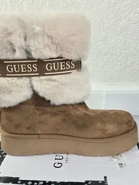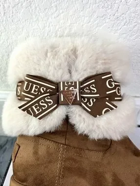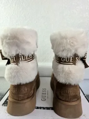 Guess Denla Booties Furry Suede On Platform Soles, Logo Bow & Pin