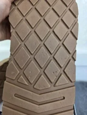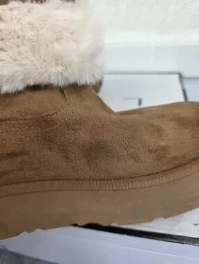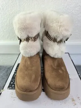 This pair is in good pre-owned condition, the fur inside is still soft and plush, the suede is in nearly new condition, however, there is one faint spot on the inner side of the left boot near the ball of the foot. It's not very obvious, since the nap on suede can create "spots" here and there!