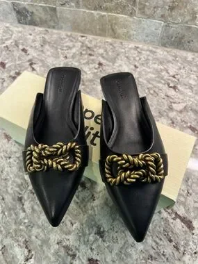Sleek black leather pointed mule with a bold gold twisted chain accent. Slip-on style for effortless wear and a polished look. Versatile black design elevates both casual and dressy outfits.