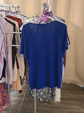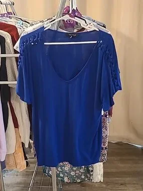 Beatiful royal blue White House Black Market oversized v neck top with braided fabric shoulder design for a fun, unique look. Can be worn for going out with a boho or preppy style or dressed up with trousers or a skirt for the office. In excellent condition.