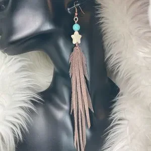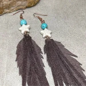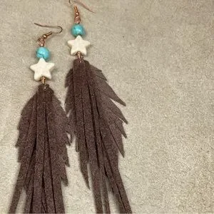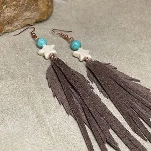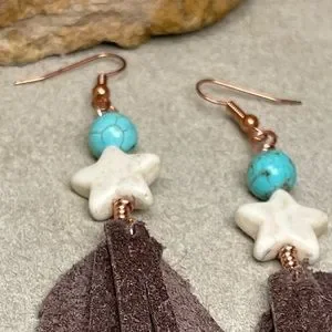 These Fringe Earrings Were Designed With Genuine Brown Pebble Grain Leather And Features A Star Shaped Howlite Gemstone With A Turquoise Bead
