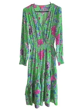 Bright green midi dress with pink and purple floral print. V-neck with long sleeves and smocked waist. Layered ruffle hem for a feminine silhouette. Lightweight, flowy fabric perfect for spring and summer.