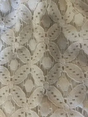 Anthropologie mini skirt in cream lace. Features an exposed center back zipper. Scalloped lace overlay with subtle A-line shape. Feminine and versatile for day or evening.