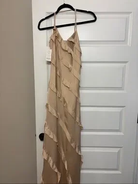 Satin-like beige maxi with diagonal cascading ruffles. Thin adjustable spaghetti straps. Sleek V-neck silhouette. Flowy, elegant drape for events.
