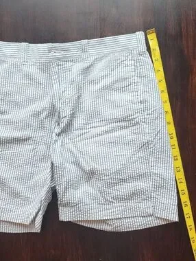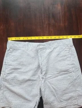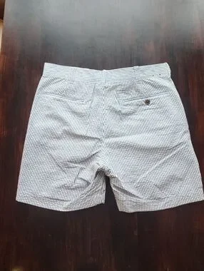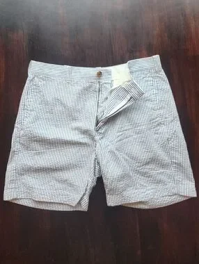 Lightweight seersucker flat front shorts. Blue and white striped pattern. Button and zip fly with belt loops. Casual summer staple for warm days.