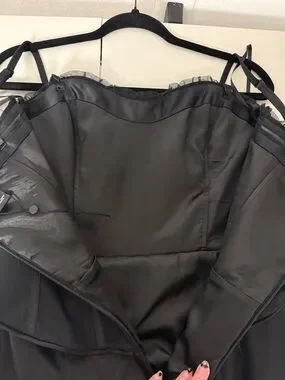 Stunning black satin maxi dress by White House Black Market featuring a structured corset bodice with boning and delicate lace trim. Adjustable straps and a flattering A-line silhouette make this perfect for formal events, weddings, or evening wear.