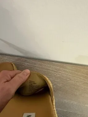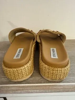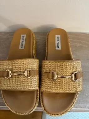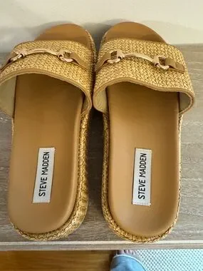 Steve Madden Tan Woven raffia Slide Mules with Gold Accent