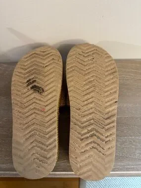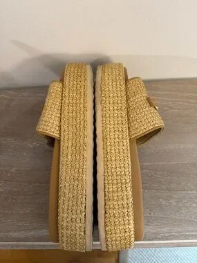 Woven raffia-style upper with a gold-tone bit detail. Slip-on mule silhouette with cushioned footbed. Versatile neutral tan shade for easy styling. Great condition