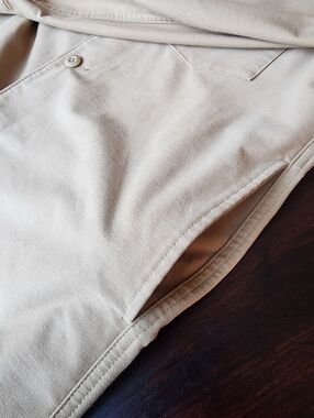 Lightweight shirt jacket in a neutral beige tone. Button-front closure with two chest flap pockets. Clean collar and simple, versatile styling. Easy layering piece for casual outfits.