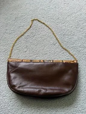 Chic snake-print shoulder bag with scalloped flap and gold chain strap. Features brown and tan tones for versatile styling. Lightweight and structured for everyday or evening wear. The gold chain adds a polished finish. 8inx13in