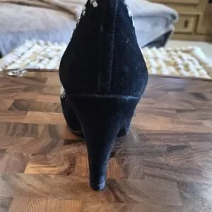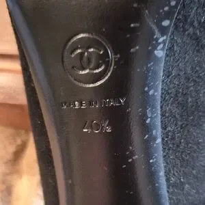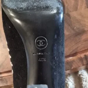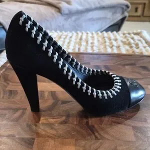 CHANEL stunning suede and leather heels in black with contrasting gray whipstitch trim. Leather cap-toe with embossed CC emblem. Chic silhouette for versatile wear.