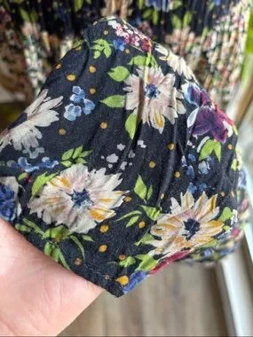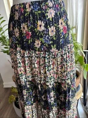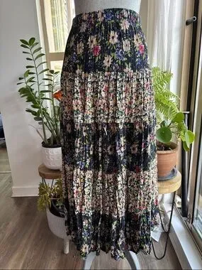 Vintage Black Floral Tiered Maxi Skirt with Pink and Blue Blossoms