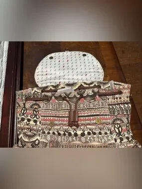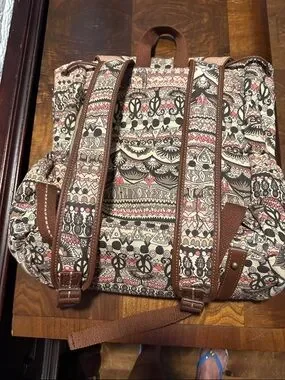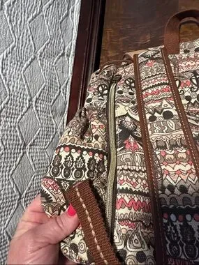 Sakroots canvas backpack with detailed ethnic-inspired print. Beige and brown canvas trim. Small pink accent dots throughout the pattern. Front flap and pocket closure. Adjustable shoulder straps for comfort.