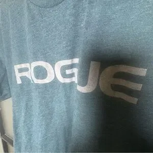 Official Rogue Fitness graphic t-shirt in a heathered blue color featuring the bold ROGUE logo on the front and a tonal American flag graphic on the sleeve.