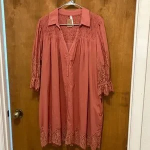 Lightweight midi dress from Anthropologie. Deep V neckline with button front. Smocked shoulders and relaxed fit. Lace detailing on sleeves and hem. Soft, muted mauve-rust color. PTP 22. Fully lined has pockets.