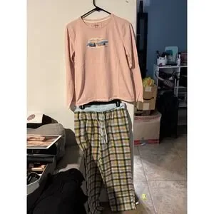 LL Bean Womens Pajama Set Peach Graphic Long Sleeve Top Plaid Pants Small