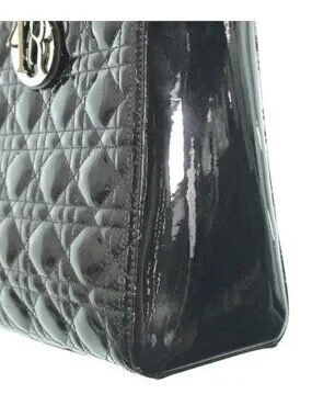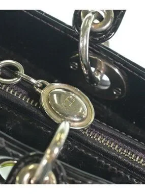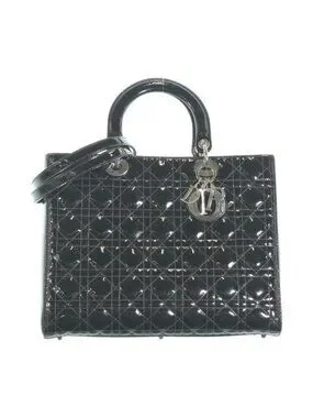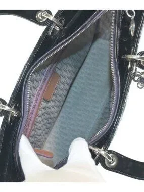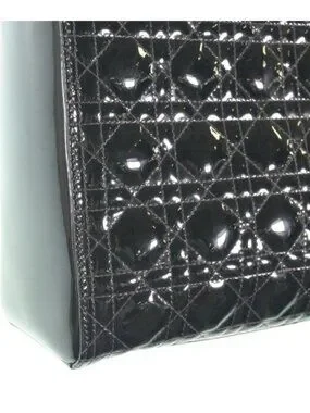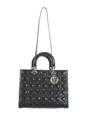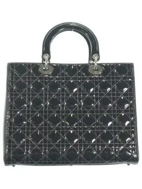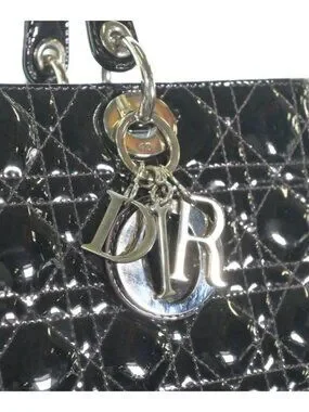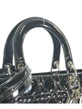 This is an authentic Dior Lady Dior handbag in a striking purple patent leather. The bag features the iconic Cannage quilting pattern and polished silver-tone hardware, including the signature Dior charms that dangle from the top handles.