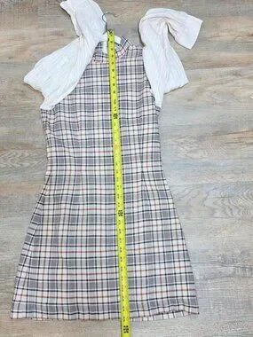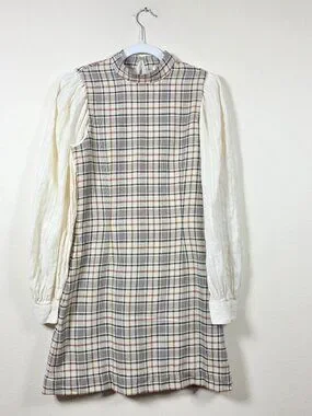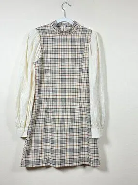 Multicolor plaid cotton (54% Wool, 46% Viscose). Shift. Long sleeves. Mock neck. Back zipper closure. 34.5" from shoulder to hemline. Imported.