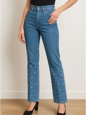 • Color: Classic medium blue wash with floral/star lower-leg print