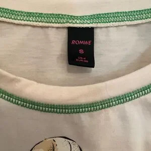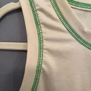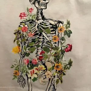 Stylish tank top featuring a unique floral skeleton graphic. Cream color with green trim.