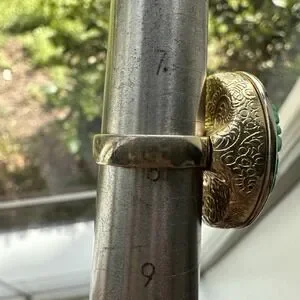 This vintage 1970s Avon Perfume Glacé Adjust Locket Ring features an oval-shaped faux green color mottled jade resin stone set in yellow gold plated steel alloy. The ring is adjustable in size 8 and is signed by Avon. It is a unique piece with a Bird of Paradise theme, perfect for various occasions like Mother's Day, Easter, Christmas, graduation, engagements, weddings, anniversaries, birthdays, and more. This Avon women's ring is adjustable and is in good pre owned clean condition with normal use wear, some rub or gold loss on high spots, stone is original and in good shape. Please review the pictures for more details and size measurement info thank you.