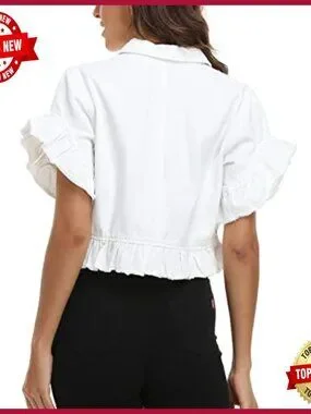 Cropped Denim Jacket with Ruffle Sleeves, Distressed Hem, Fitted Fit