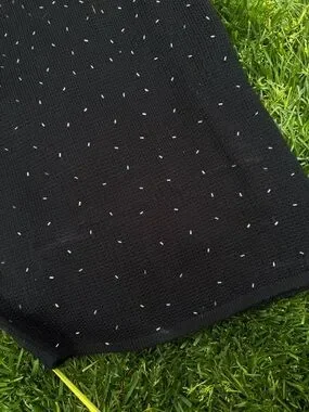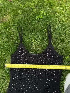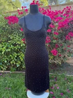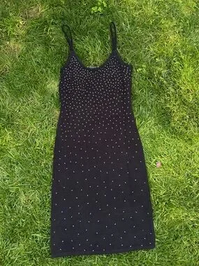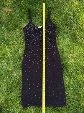 Slim-fitting black midi dress with delicate spaghetti straps. Silver bead embellishments create subtle shimmer across the bodice and skirt. Scoop neckline and figure-hugging silhouette. Polished look for evening affairs.