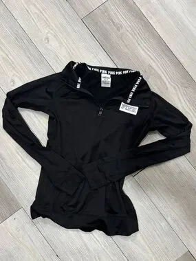 Sleek black half-zip pullover from PINK Victoria's Secret. Long sleeves with slim fit. Branded trim at the collar for subtle detail. Lightweight stretch fabric for easy layering.