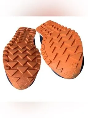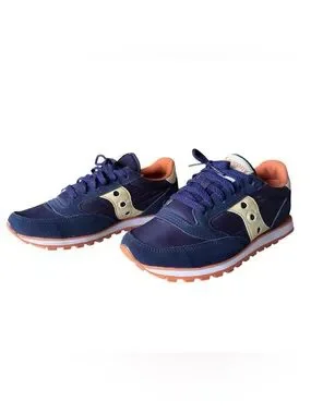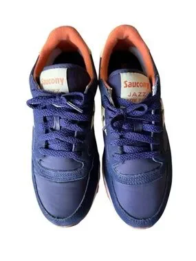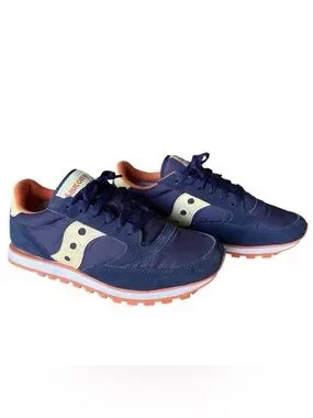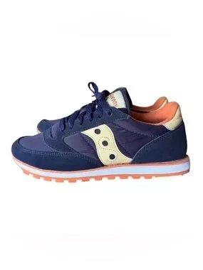 Classic Saucony Jazz sneaker. Navy upper with cream logo and coral accents. Lightweight casual style. Padded collar and cushioned sole.