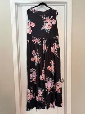 Flowing sleeveless maxi dress in black with a pink floral pattern. Lightweight, soft fabric for all-day comfort. Feminine gathered waist for a flattering silhouette. Easy-to-style dress for casual and dressy occasions. Includes pink floral color details.