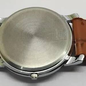 Classic Seiko quartz dress watch. Deep green sunburst dial with silver Roman numerals and hands. Polished silver-tone case. Tan leather strap for a refined look. Simple and elegant design.