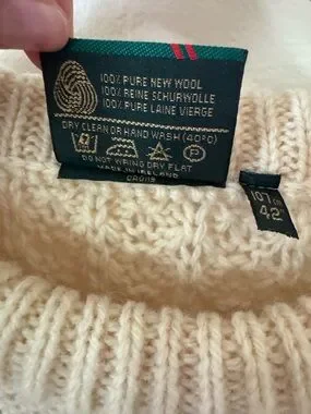Authentic vintage Gaeltarra Handcrafted Ireland fisherman sweater in classic cream natural wool. This beautiful heritage knit features traditional Aran cable and textured stitch patterns and is made from 100% pure new wool, offering warmth, durability, and timeless style.