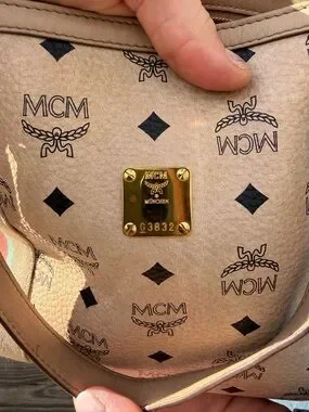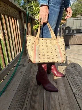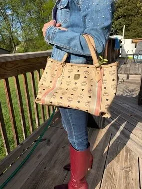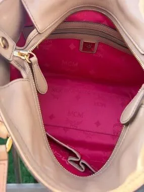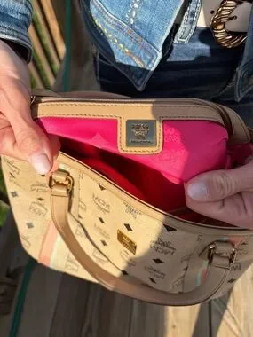 MCM tote in beige monogram canvas. Pink and green striped trim accents the front. Rolled leather handles for easy carry. Gold tone logo plaque on front. Clean, classic silhouette for everyday wear.