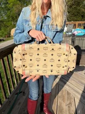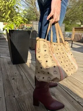 MCM Beige/Pale Pink Monogram Canvas Tote with Striped Trim