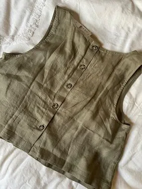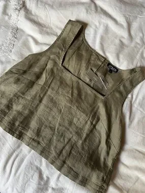 Sleeveless linen tank with a square neckline and fitted chest. Lightweight breathable fabric. Button up back. So mad I couldn’t fit this it’s so cute
